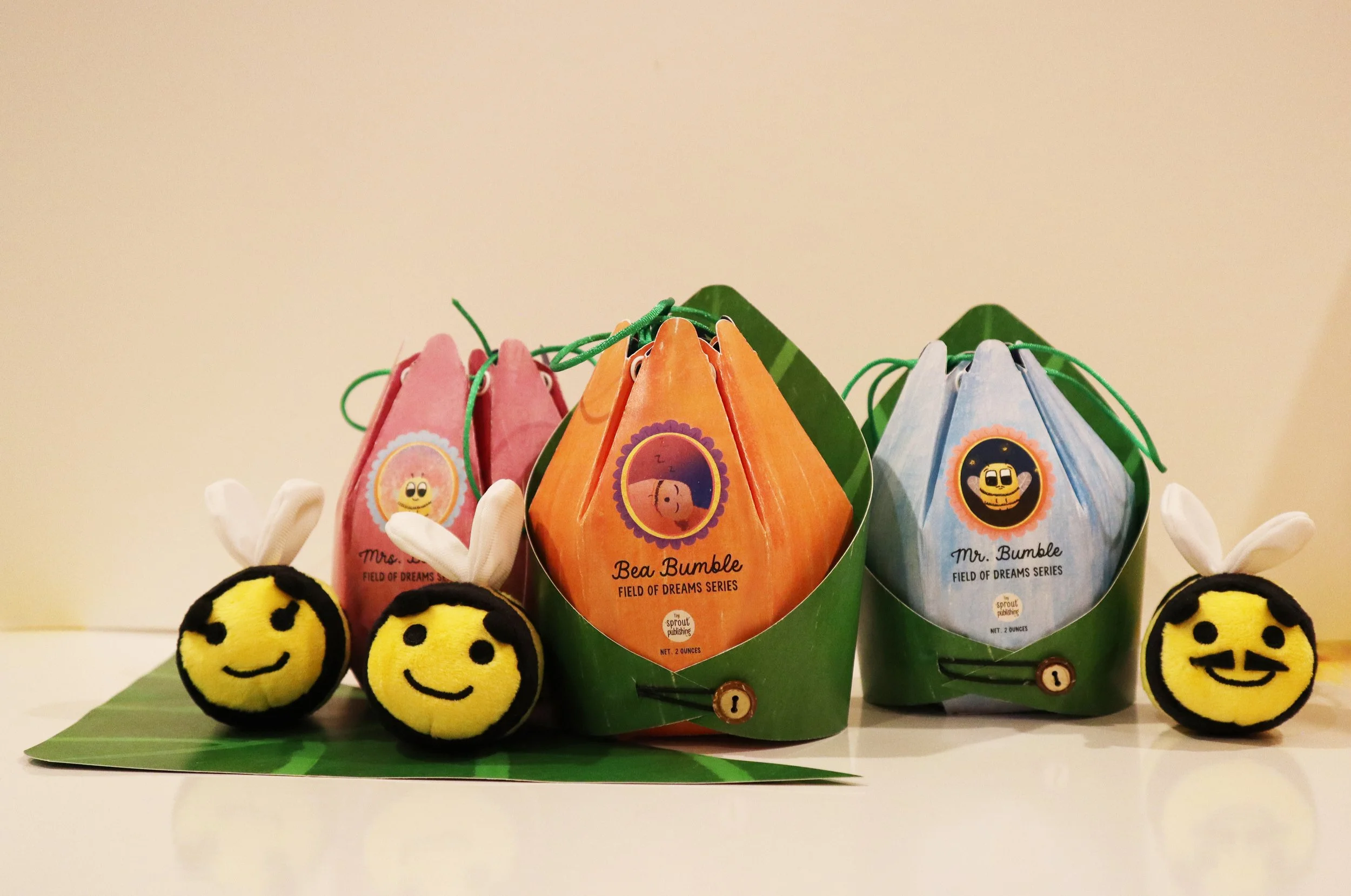The packaging was designed to reinforce key themes from the story, comfort, exploration, and courage, while offering multiple layers of interaction. The detachable hive base, transparent cutout window, and flower pouch were chosen to make the system multifunctional, allowing it to shift from storage to storytelling to imaginative play. The decision to incorporate a nightlight ability and flower projection helps children recreate Bea’s world in a tactile, comforting way. Soft shapes, natural textures, and the leaf playmat with button and elastic closure were selected to emphasize warmth and craft, giving the child a dedicated space to engage with the character. Every element supports the narrative while encouraging open-ended play, making the packaging an extension of the book’s emotional and visual experience.