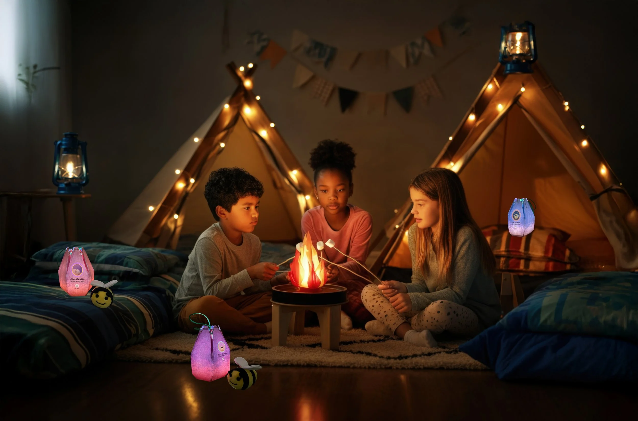 The challenge was to create packaging for a children’s book and plush character that felt both functional and narrative-driven. The system needed to protect the product, communicate the story of Bea’s first night away from the hive, and transform into interactive elements that extend play beyond the unboxing moment. Additional constraints included designing components that children could operate independently, ensuring materials were safe and durable, and integrating illumination features, such as the phone activated nightlight and flower projection, without compromising structural stability. The packaging also had to remain intuitive, educational, and visually cohesive across multiple detachable parts.