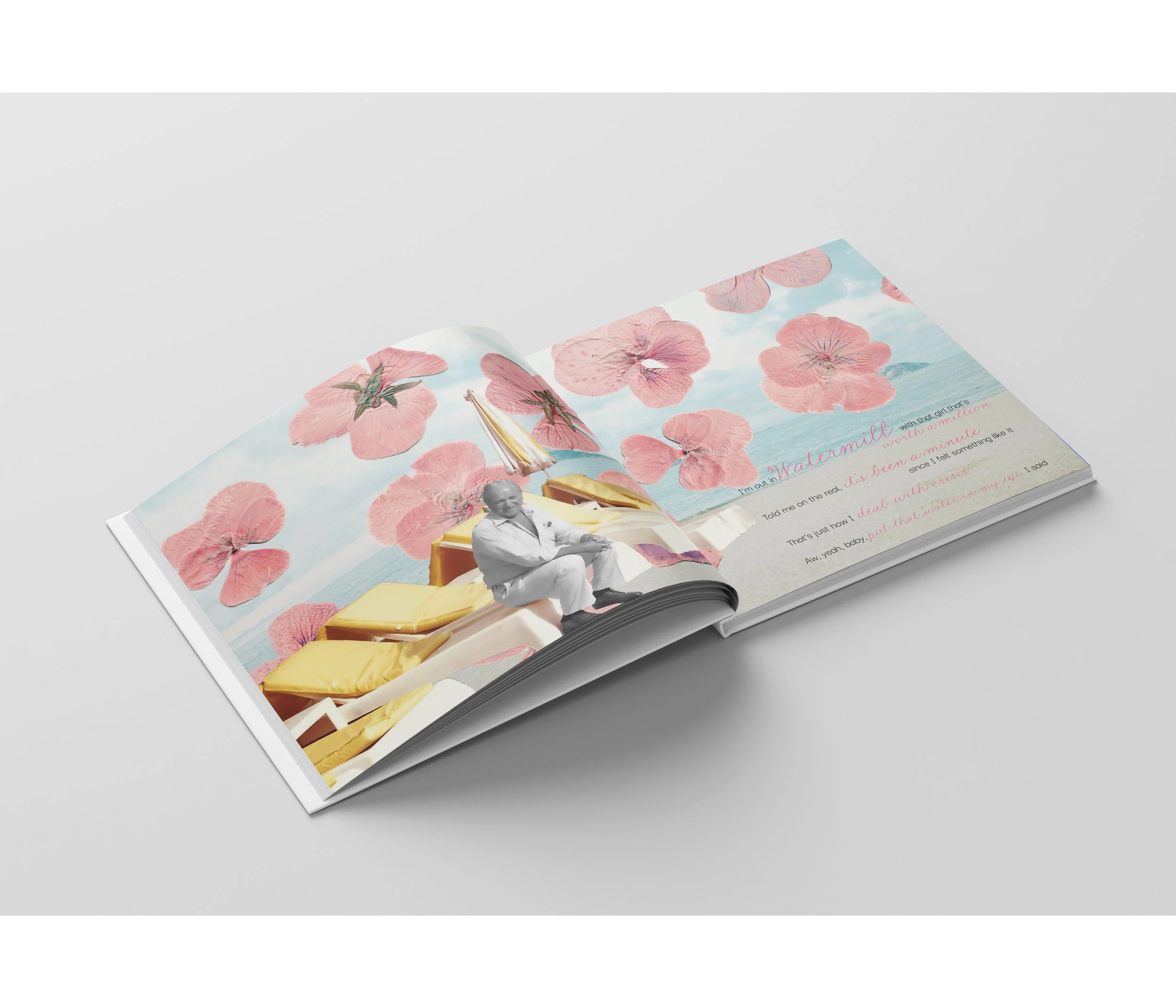 This lyric book for “Summer in the Hamptons” by Brooke Alexx — a song about how her parents fell in love. In response, I created a visual narrative about how my grandparents met, blending personal history with the mood of the music. The result is a dreamy, collage-style book that feels both intimate and timeless.