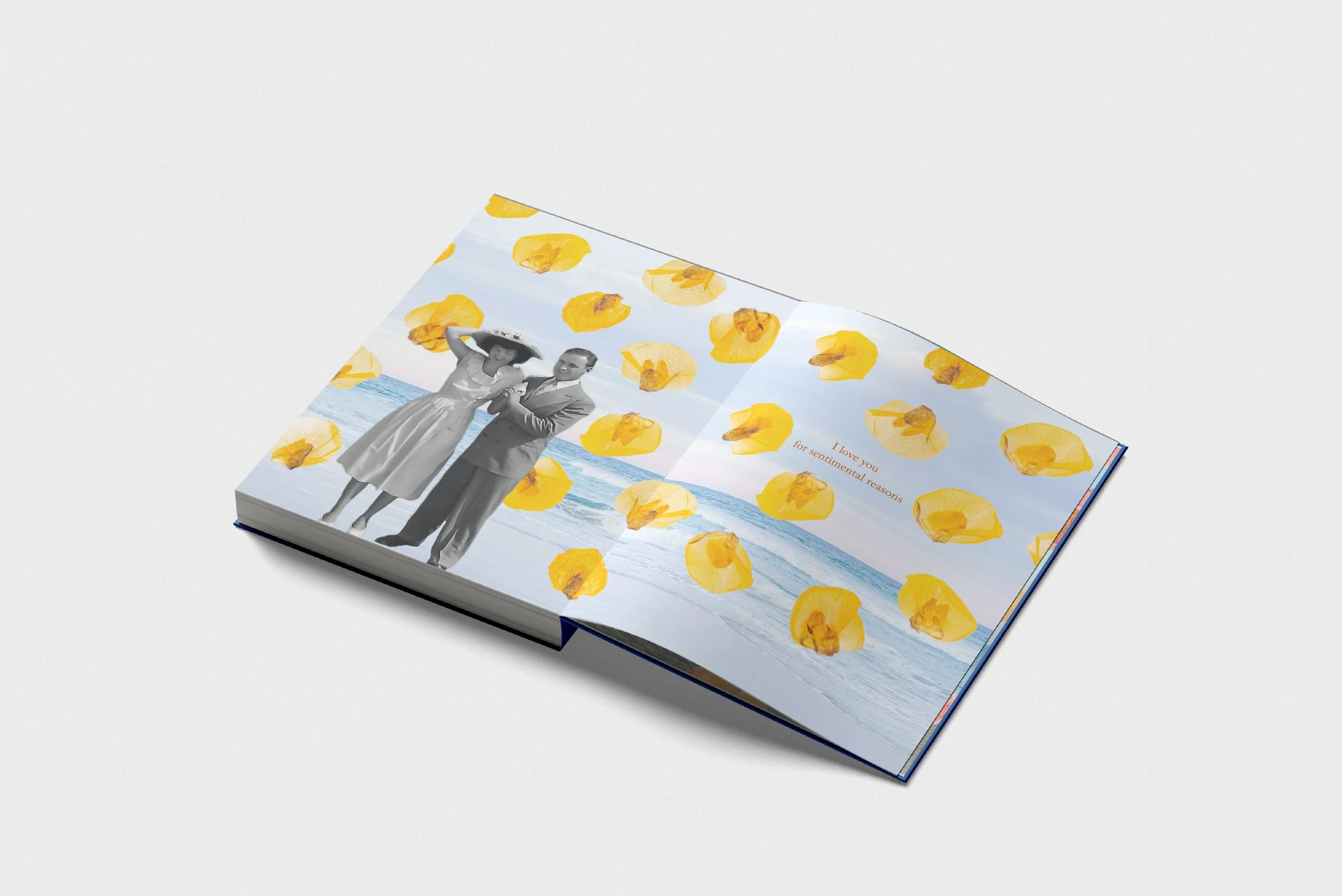 Design a visual coffee table book that captures the timeless emotion of “I Love You (For Sentimental Reasons)” while preserving a sense personal connection using collage as tools of expression. The project needed to visually harmonize with pictures from 1940s, when the song was first released, with contemporary composition techniques to bring new life into the spreads. The work embodied sentimentality while visually telling the love story of the designer’s grandparents, who first danced to this song at their wedding along the California coast. Aesthetic young women in who value beauty and art are the target audience. They see their homes as an extension of their personal style and enjoy curating meaningful objects that feel both nostalgic and artistic. Rather than shelving the book, they display it open to a favorite spread, treating it as a piece of visual decoration that adds sentiment and softness to their space.