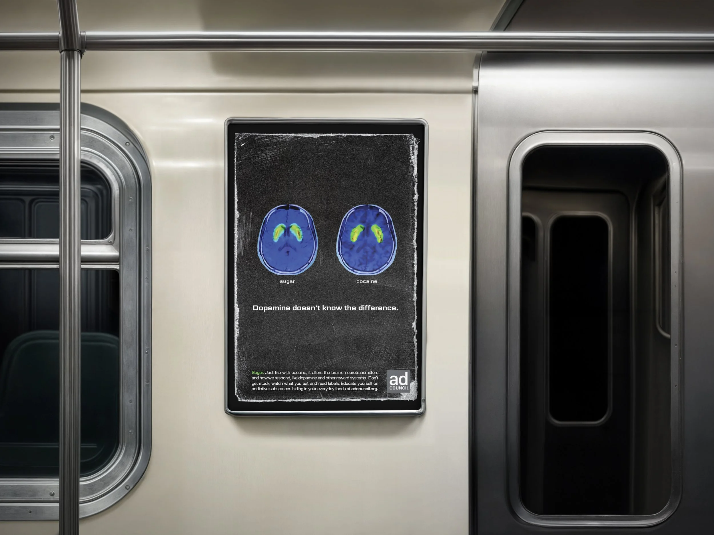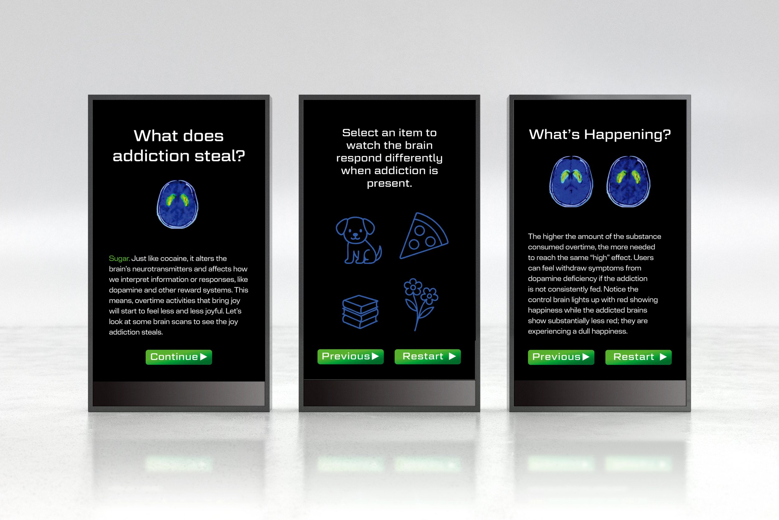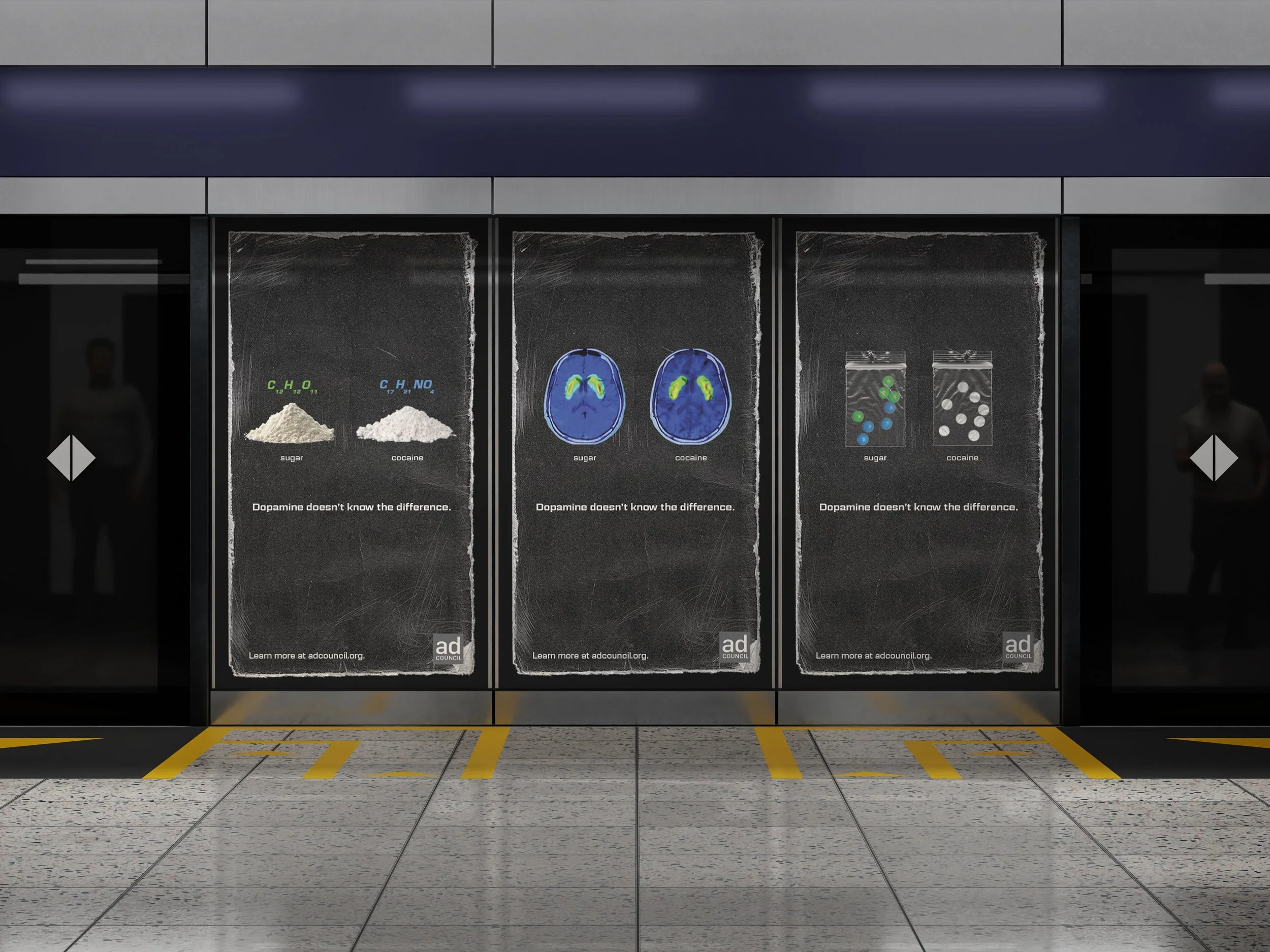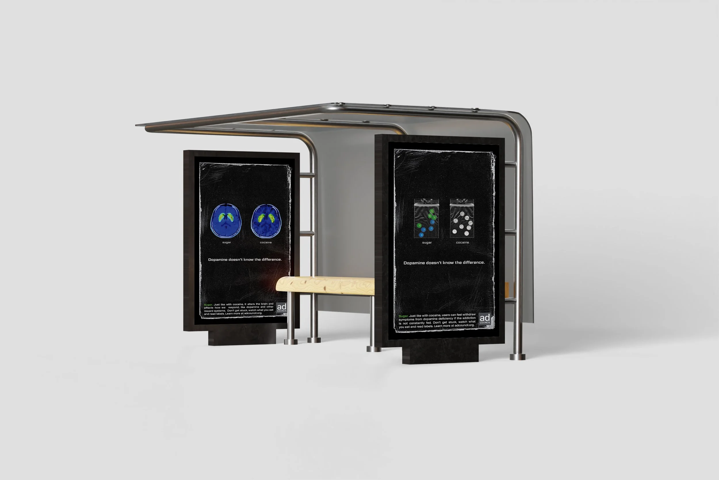 Sugar and cocaine needed to be compared to highlight similarities. After researching visual ways to compare the substances, it was decided the visual relationships with the strongest similarities were brain scans showing effects of addiction, plastic bags holding the substances, or the powder form paired with the chemical formula. Keeping all visuals cohesive a neon green and blue were chosen as the accent colors in order to keep brain scans as scientifically accurate as possible. Placing the design in areas of transit ensured a space where viewers naturally are taking a moment to look up from their phones to navigate. Even going as far as to create an interactive kiosk to see what addiction to both sugar and cocaine does for mental health. To bring the messaging full circle when they arrive at their location we continue the messaging on their screen.